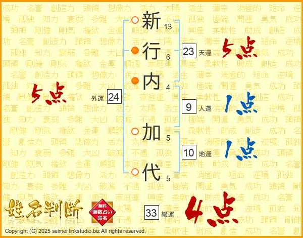 生活面を象徴する運勢です。外部から受ける影響力を表し、結婚運、家庭運や職場、環境への順応性を表します。総運から人運を引いた画数。姓や名が1文字の場合を除く。