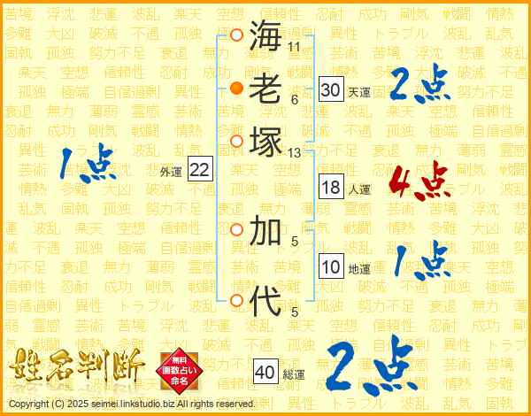 海(11画)老(6画)塚(13画) 加(5画)代(5画)