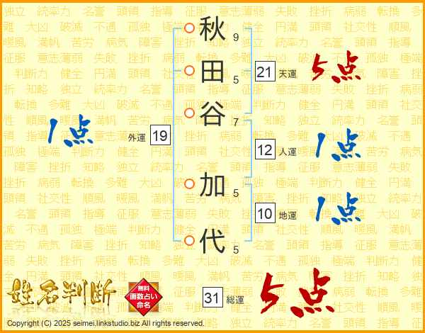 秋田谷加代さんの天運は21画の5点!