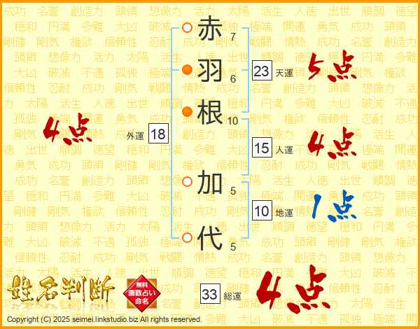 赤(7画)羽(6画)根(10画) 加(5画)代(5画)