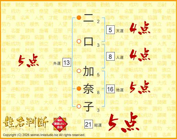 二(2画)口(3画) 加(5画)奈(8画)子(3画)