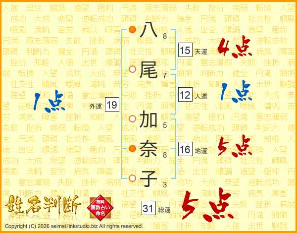 八(8画)尾(7画) 加(5画)奈(8画)子(3画)