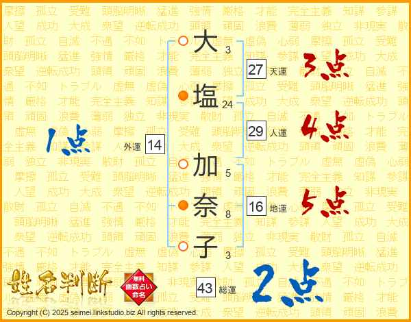 大(3画)塩(24画) 加(5画)奈(8画)子(3画)