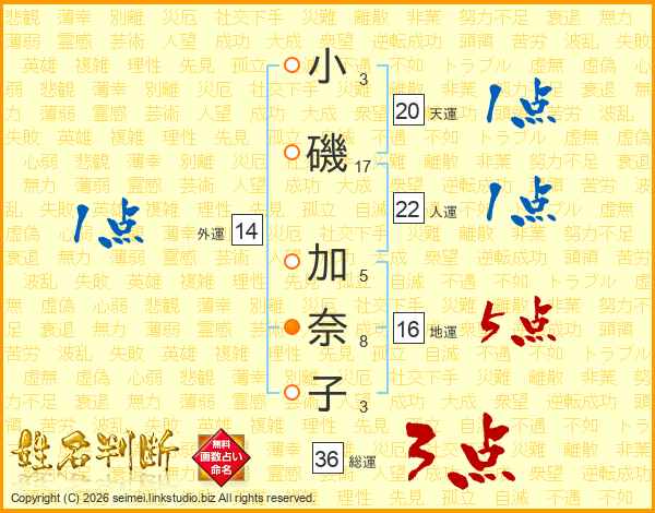 小(3画)磯(17画) 加(5画)奈(8画)子(3画)