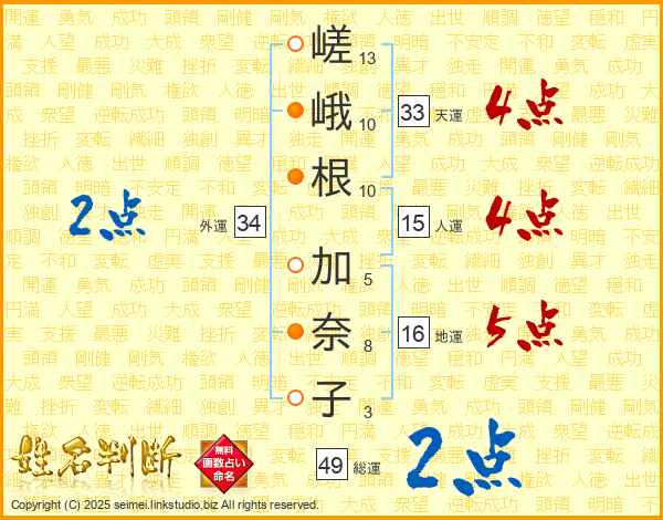 嵯峨根加奈子さんの天運は33画の4点!