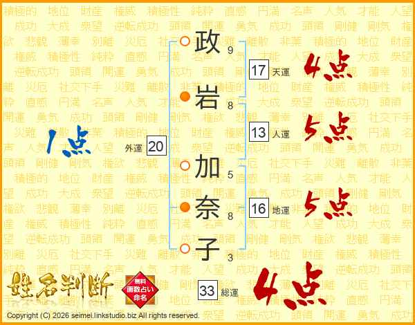 政(9画)岩(8画) 加(5画)奈(8画)子(3画)