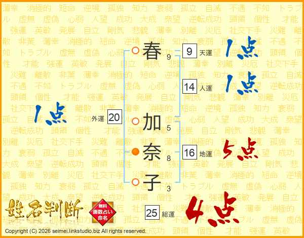 生活面を象徴する運勢です。外部から受ける影響力を表し、結婚運、家庭運や職場、環境への順応性を表します。総運から人運を引いた画数。姓や名が1文字の場合を除く。