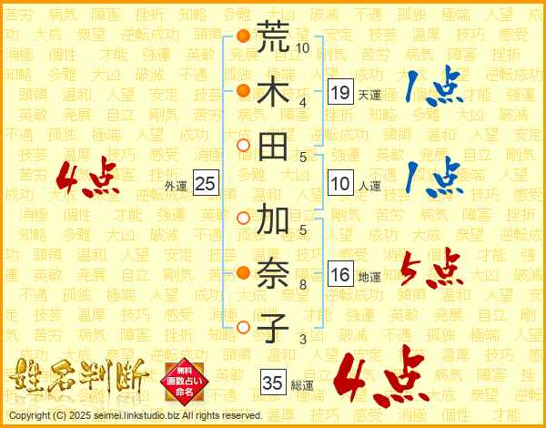 荒(10画)木(4画)田(5画) 加(5画)奈(8画)子(3画)