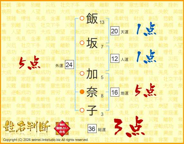 飯(13画)坂(7画) 加(5画)奈(8画)子(3画)
