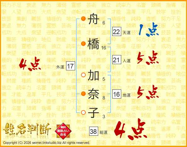 舟(6画)橋(16画) 加(5画)奈(8画)子(3画)