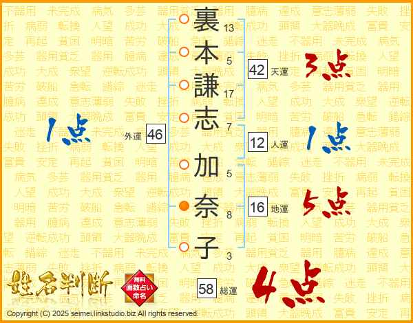 裏(13画)本(5画)謙(17画)志(7画) 加(5画)奈(8画)子(3画)
