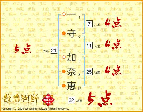 一(1画)守(6画) 加(5画)奈(8画)恵(12画)