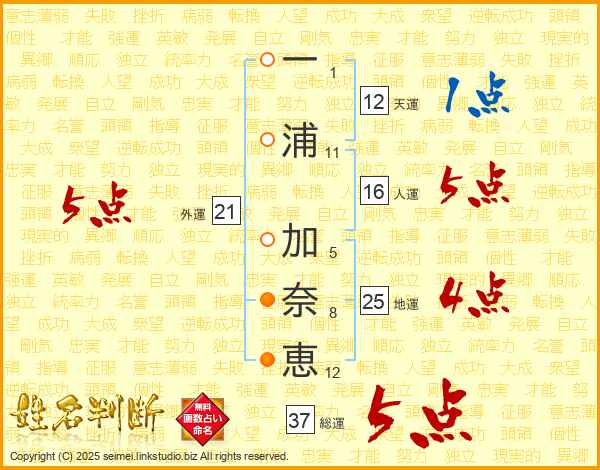 一(1画)浦(11画) 加(5画)奈(8画)恵(12画)