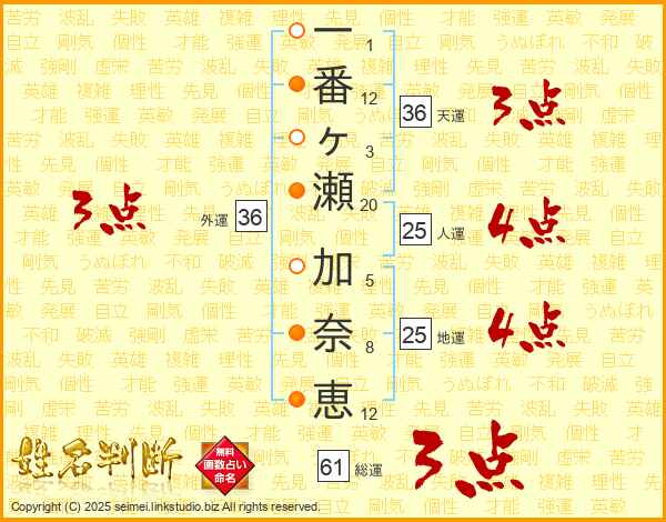 一(1画)番(12画)ヶ(3画)瀬(20画) 加(5画)奈(8画)恵(12画)