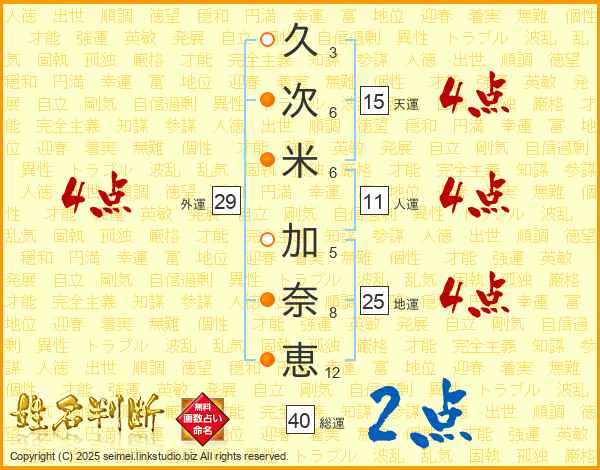 久(3画)次(6画)米(6画) 加(5画)奈(8画)恵(12画)