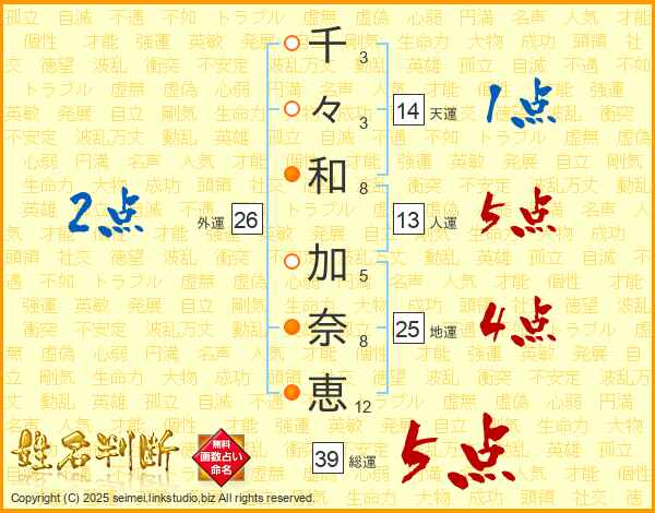 千(3画)々(3画)和(8画) 加(5画)奈(8画)恵(12画)