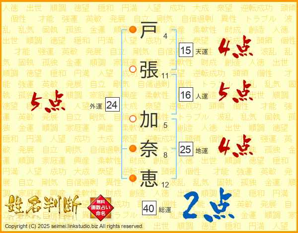 戸(4画)張(11画) 加(5画)奈(8画)恵(12画)