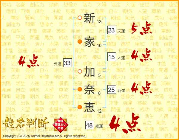 新(13画)家(10画) 加(5画)奈(8画)恵(12画)