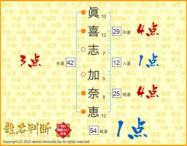 眞(10画)喜(12画)志(7画) 加(5画)奈(8画)恵(12画)