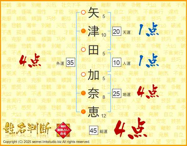 矢津田加奈恵さんの総運は45画の4点!