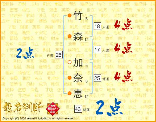 竹(6画)森(12画) 加(5画)奈(8画)恵(12画)