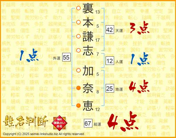 裏本謙志加奈恵さんの総運は67画の4点!
