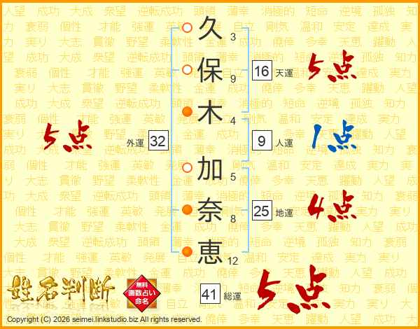 久(3画)保(9画)木(4画) 加(5画)奈(8画)恵(12画)