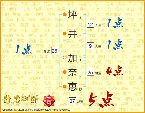坪(8画)井(4画) 加(5画)奈(8画)恵(12画)