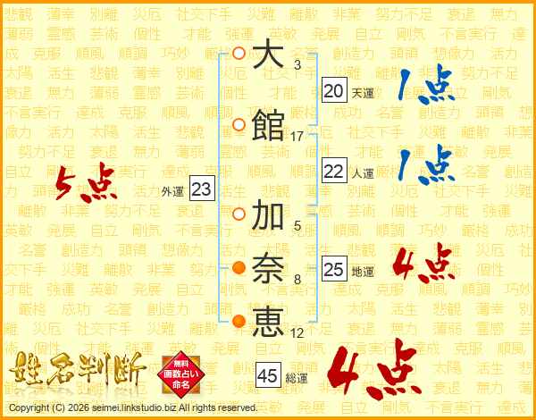 大(3画)館(17画) 加(5画)奈(8画)恵(12画)