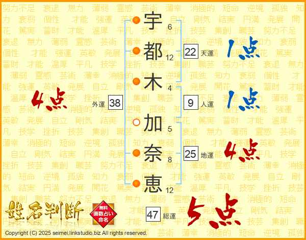 宇(6画)都(12画)木(4画) 加(5画)奈(8画)恵(12画)