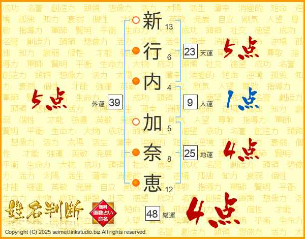 新(13画)行(6画)内(4画) 加(5画)奈(8画)恵(12画)