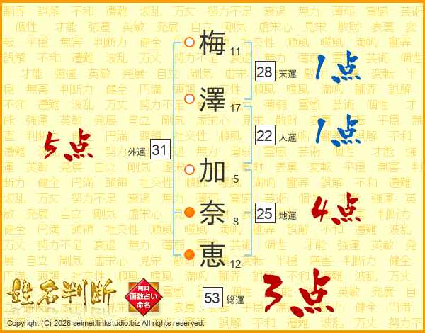 梅(11画)澤(17画) 加(5画)奈(8画)恵(12画)