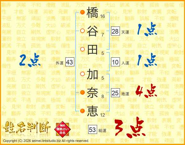 橋谷田加奈恵さんの総運は53画の3点!