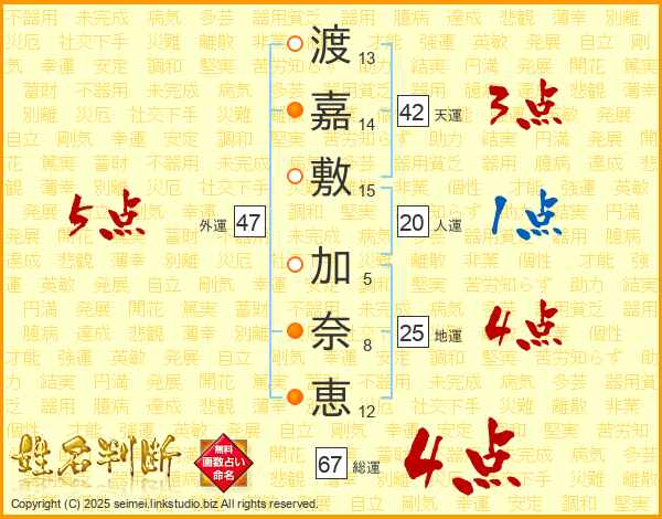 渡嘉敷加奈恵さんの外運は47画の5点!