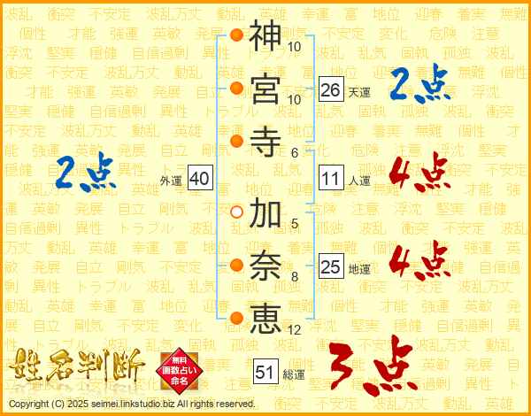 神(10画)宮(10画)寺(6画) 加(5画)奈(8画)恵(12画)
