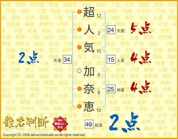 超(12画)人(2画)気(10画) 加(5画)奈(8画)恵(12画)