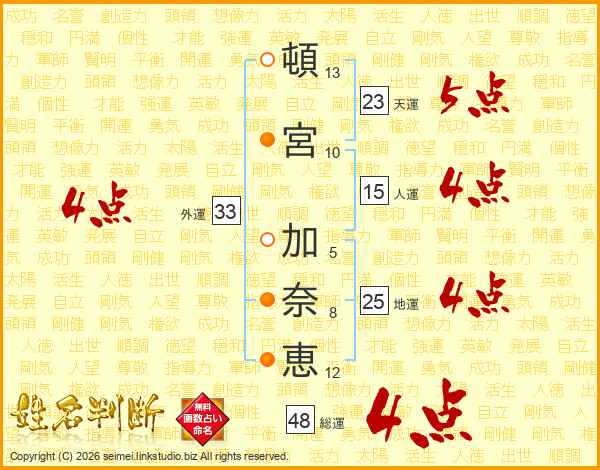 頓(13画)宮(10画) 加(5画)奈(8画)恵(12画)