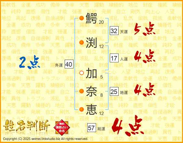 鰐(20画)渕(12画)  加(5画)奈(8画)恵(12画)