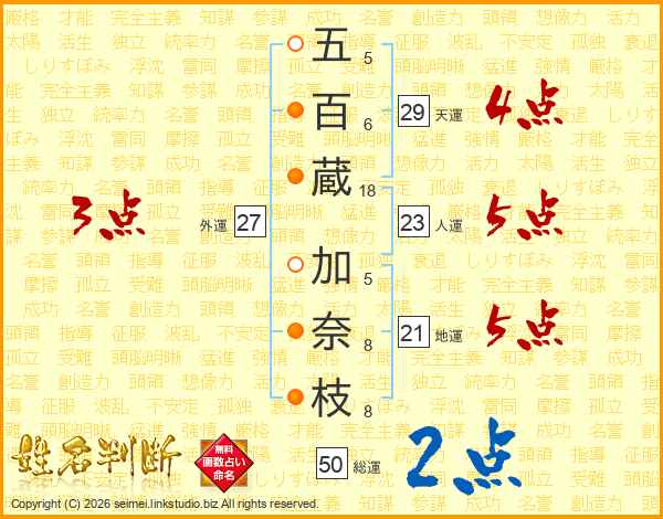 五(5画)百(6画)蔵(18画) 加(5画)奈(8画)枝(8画)