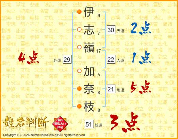 伊(6画)志(7画)嶺(17画) 加(5画)奈(8画)枝(8画)