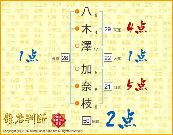八(8画)木(4画)澤(17画) 加(5画)奈(8画)枝(8画)