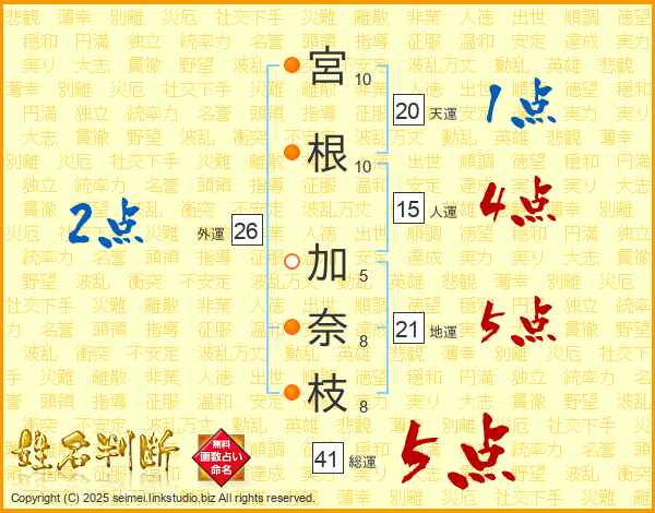 宮(10画)根(10画) 加(5画)奈(8画)枝(8画)