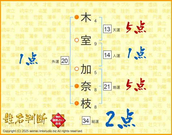 木(4画)室(9画) 加(5画)奈(8画)枝(8画)