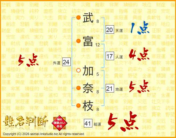 武(8画)富(12画) 加(5画)奈(8画)枝(8画)