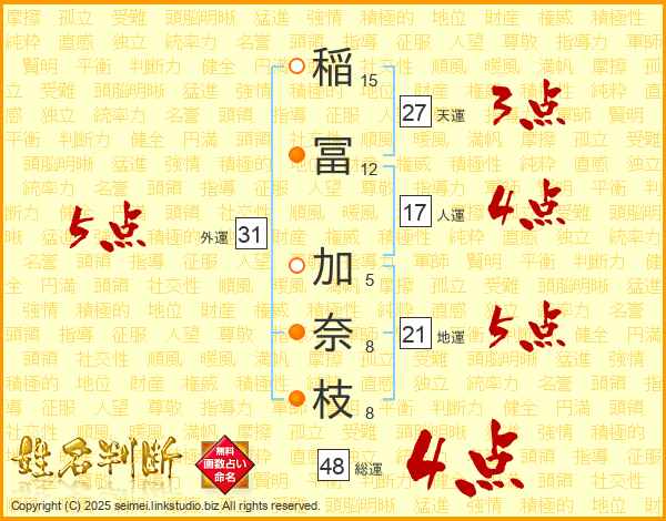 稲(15画)冨(12画) 加(5画)奈(8画)枝(8画)