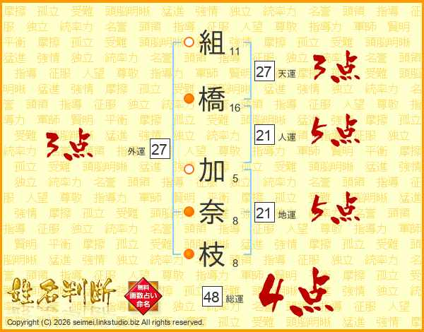 組(11画)橋(16画) 加(5画)奈(8画)枝(8画)