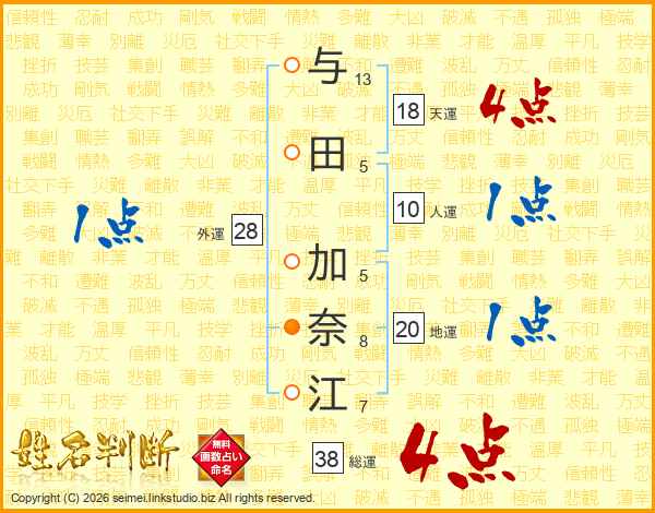 与(13画)田(5画) 加(5画)奈(8画)江(7画)