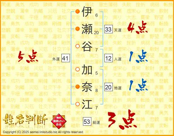 伊(6画)瀬(20画)谷(7画) 加(5画)奈(8画)江(7画)