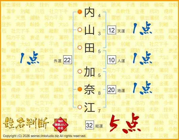 内(4画)山(3画)田(5画) 加(5画)奈(8画)江(7画)