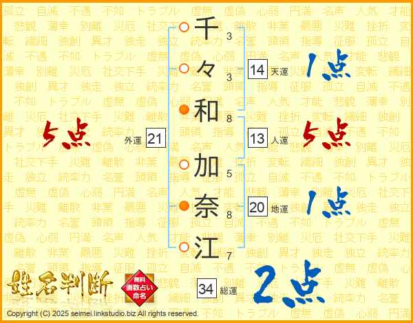 千(3画)々(3画)和(8画) 加(5画)奈(8画)江(7画)